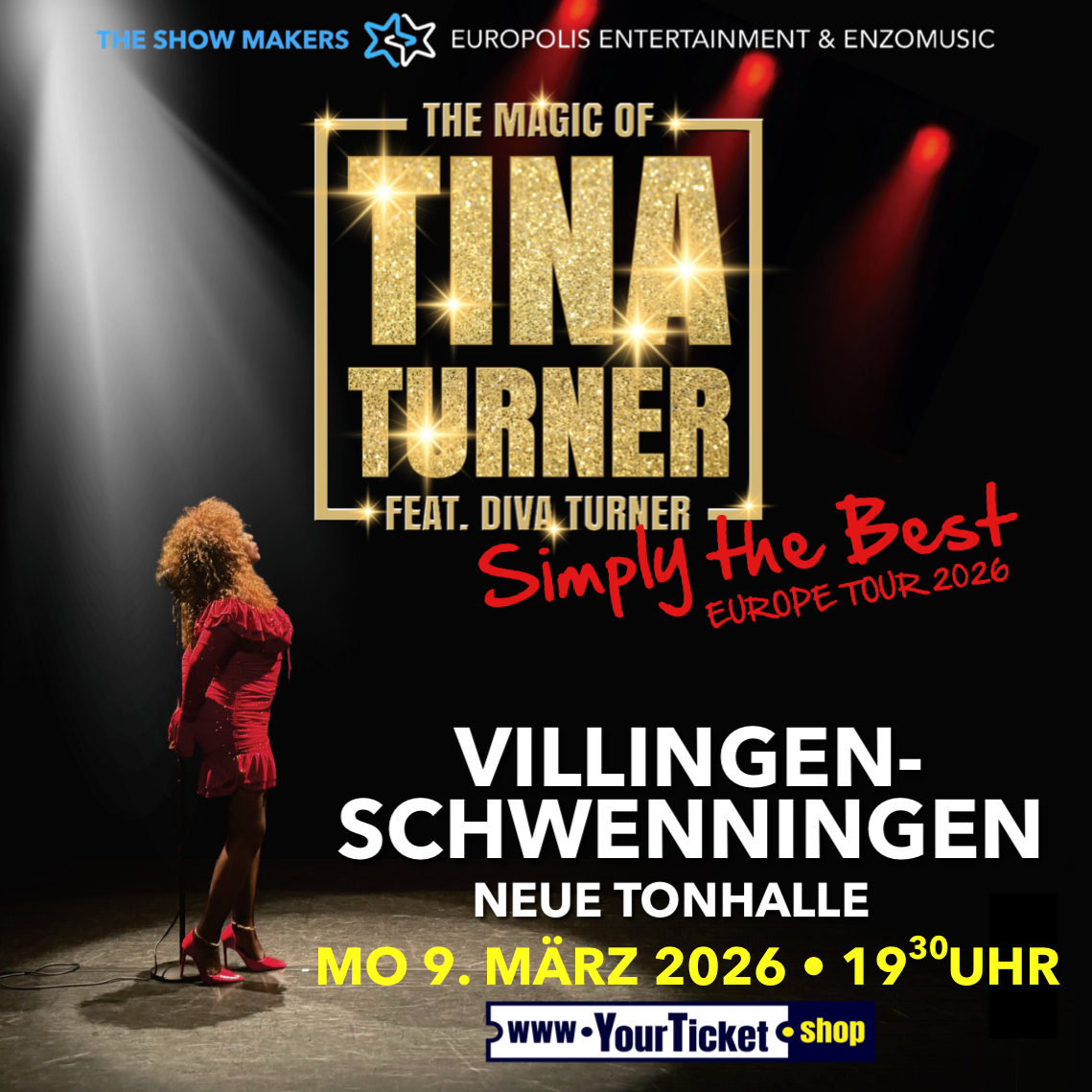 Tauchen Sie ein in die Welt von Tina Turner mit dieser einzigartigen Concert Tribute Show THE MAGIC OF TINA TURNER >>> featuring DIVA TURNER aus den Niederlanden (Finalist der großen TV Show „THE TRIBUTE“)! Unvergleichliche Power, Leidenschaft und Stärke, neben einer außergewöhnlichen Stimme, waren die Markenzeichen der mehrfachen Grammy Awards Gewinnerin TINA TURNER und sind es auch von DIVA TURNER! Lassen Sie sich mitreißen von Tina’s größten Hits wie "What's Love Got to Do With It", "Simply the Best" „ Nutbush City Limits“, "Private Dancer" u.v.m.! . DIVA TURNER haucht der Ikone und Queen des Rock 'n' Roll neues Leben ein und entführt Sie in eine Zeit voller Glanz, Glamour und unvergesslicher Musik. Feiern Sie mit uns das Erbe und die unübertroffene Bühnenpräsenz von Tina Turner in einer Show, die Sie mitreißen und begeistern wird. Treten Sie ein in die Welt der Rocklegende und lassen Sie sich von ihrer Musik verzaubern! Ein Abend voller Hits, Emotionen und einer außergewöhnliche Performance erwarten Sie.