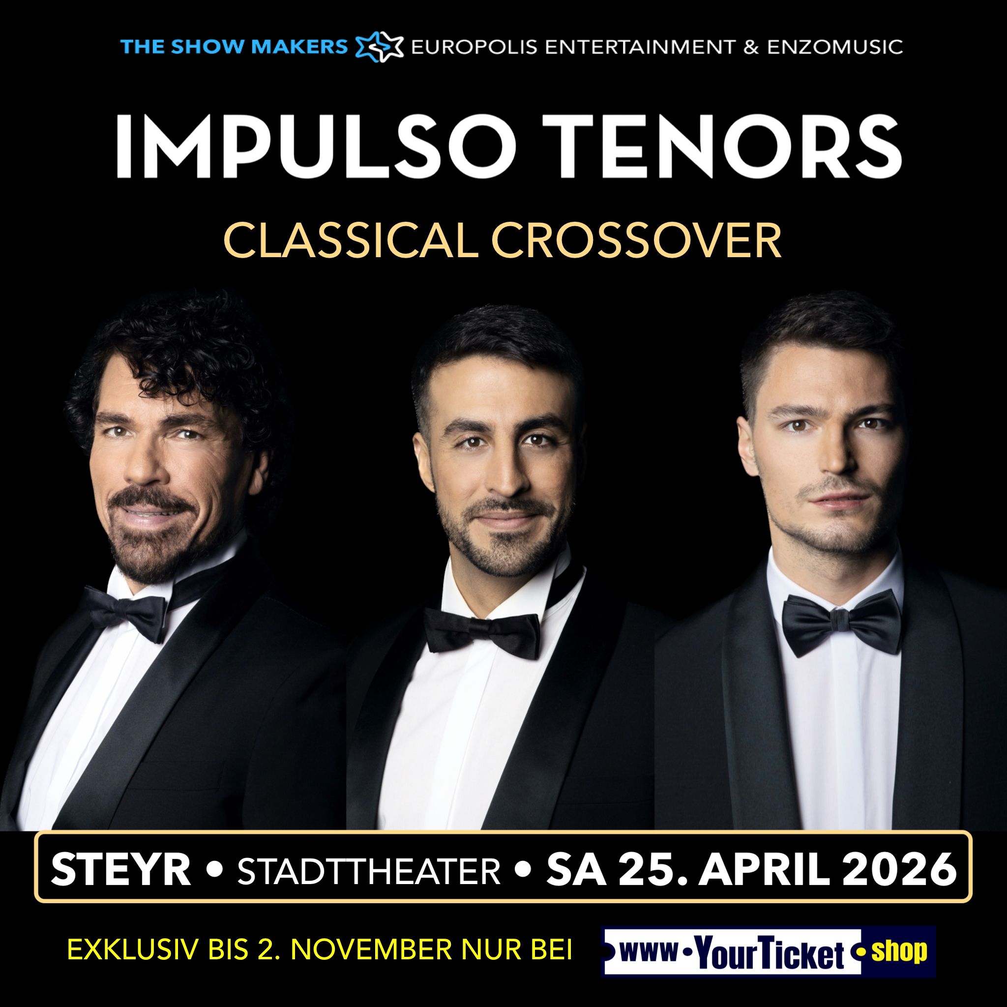 Wenn sich große Stimmen, emotionale Tiefe und stilvolle Eleganz verbinden, entsteht ein musikalisches Erlebnis, das unvergessen bleibt – genau das verkörpern die IMPULSO TENORS. Seit ihrem umjubelten Durchbruch bei The Voice of Germany haben Laszlo Maleczky, German Gholami und Val Mihelčič sich als eine der spannendsten neuen Formationen im Classical-Crossover-Genre etabliert. Mit ihrer einzigartigen Mischung aus Oper, Pop und internationalem Flair verzaubern sie die Bühnen Europas.